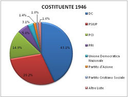 Nello stesso giorno, i cittadini italiani, uomini e donne (che per la prima volta oltre a votare possono anche essere elette).[1] Sono chiamati a scegliere tra monarchia e repubblica e ad eleggere i 556 membri dell’Assemblea costituente che dovrà scrivere la nuova Costituzione. Anche per l’Assemblea costituente, come per il Referendum, votano a livello nazionale l’ 89,1% degli elettori.